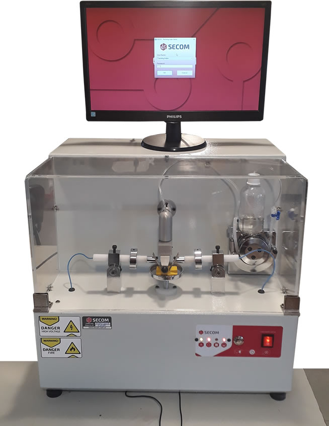 Nuestro equipo para el ensayo de Encaminamiento Electrico somete, a la muestra bajo ensayo una tensión de 0 a 600 Vca por medio de dos electrodos con una carga de 1 Newton. Entre los electrodos gotea una solución conductora a intervalos regulares programados.