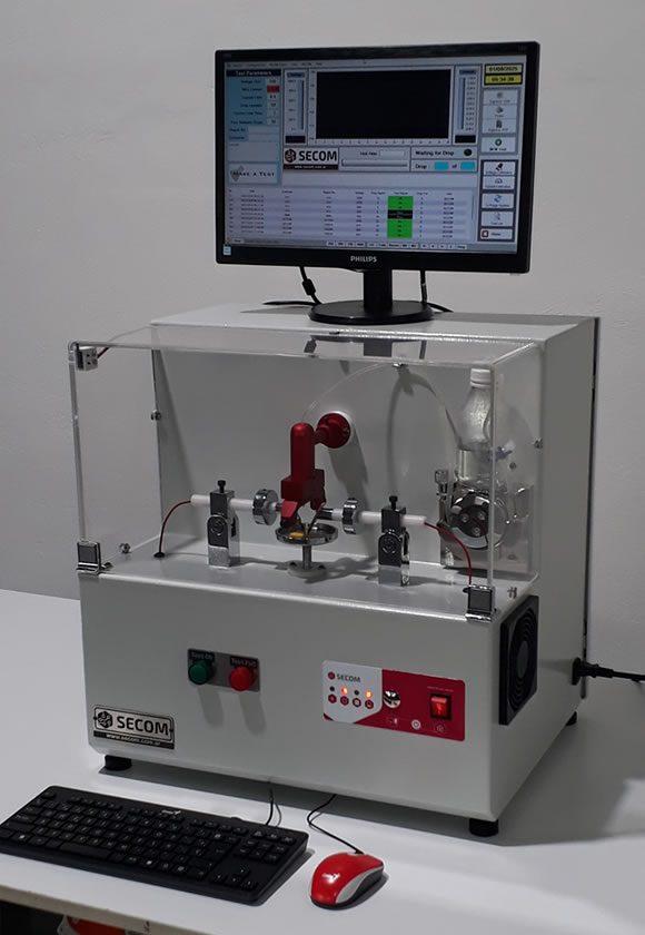 Nuestro equipo para el ensayo de Encaminamiento Electrico somete, a la muestra bajo ensayo una tensión de 0 a 1000 Vca por medio de dos electrodos con una carga de 1 Newton. Entre los electrodos gotea una solución conductora a intervalos regulares programados.