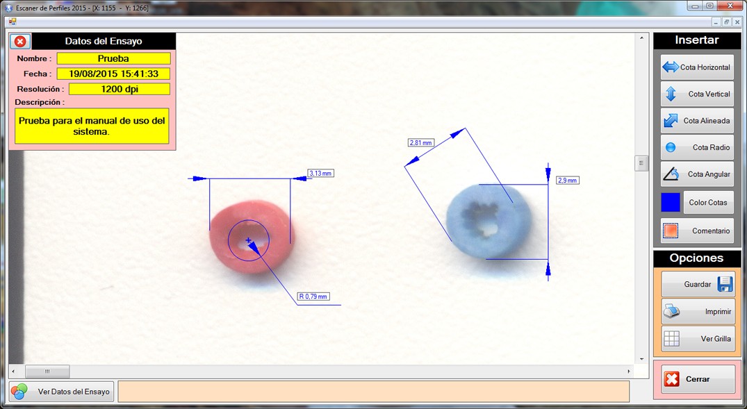 El sistema Escáner de Perfiles permite medir en pantalla a través de cursores verticales y horizontales, se puede agregar cotas como cualquier programa CAD, permite rotar la imagen, guardar archivos, generar reportes e imprimirlos o exportarlos a .pdf.